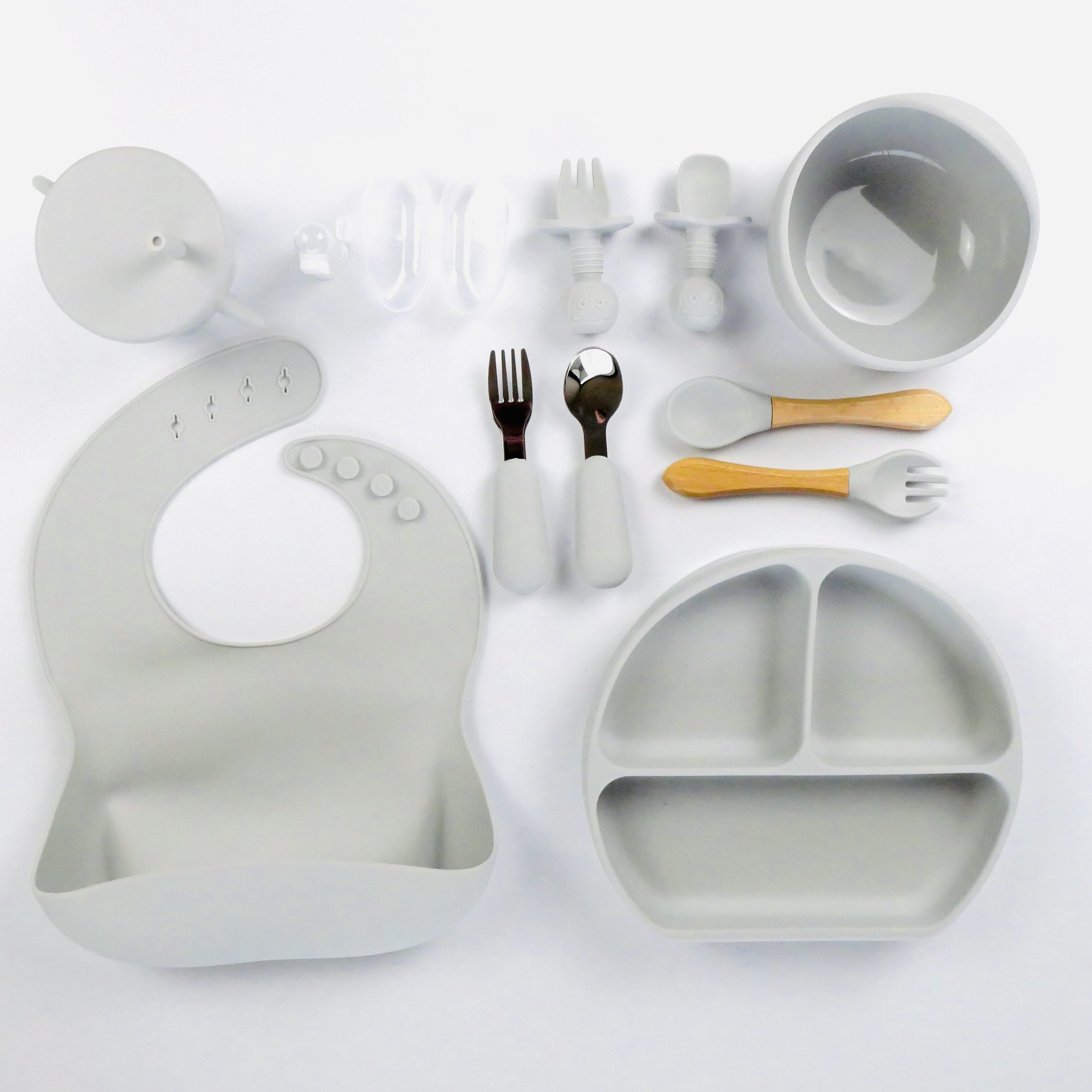 The 13 Piece Baby Weaning Set is crafted from BPA-free silicone, ensuring safety and durability for your little one. This comprehensive set includes a bowl with a secure lid, a cup with a lid, and three complete cutlery sets, designed specifically for babies aged 0 to 3 years. Each piece is easy to clean, lightweight, and ergonomically designed to support your baby's transition to solid foods comfortably and hygienically. Light Grey Colour and perfect for everyday use, this set combines functionality with high-quality materials to meet the needs of both parents and children during weaning.